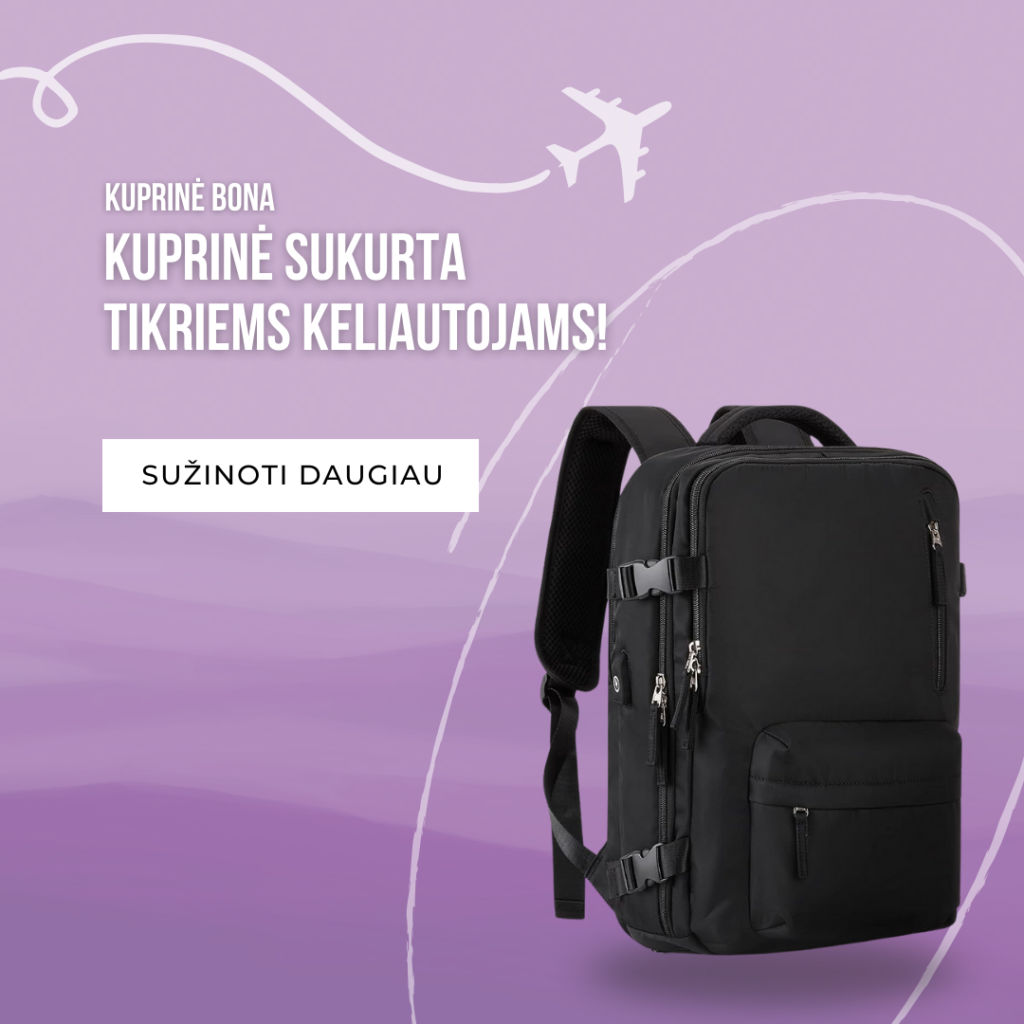 Nuostabi kuprinė, tilpo visi daiktai savaitės kelionei 🙂 įsidėjau ir kompiuterį, antrą batų porą, vandens buteliuką, drabužius. Labai džiaugiuosi, turėjau puikią kelionę.