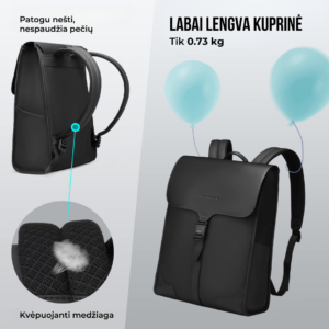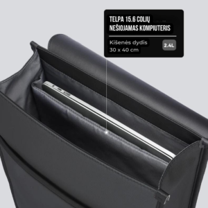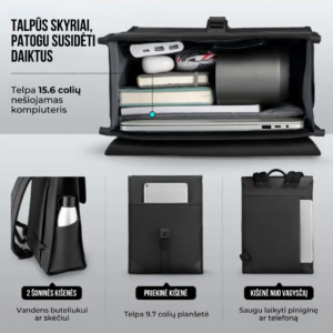 Šioje kuprinėje yra įvairių skyrių, tilps 15.6 colių nešiojamasis kompiuteris, planšetė, knygos ir kiti svarbiausi asmeninai daiktai.